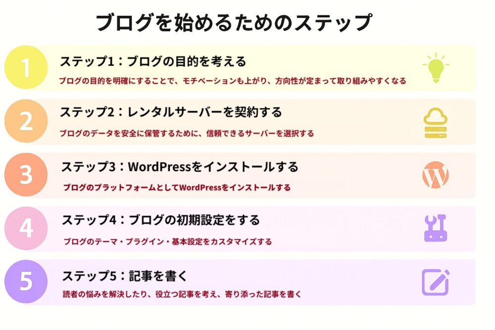 ブログを始めるには、大きく分けて5つのステップがあります。