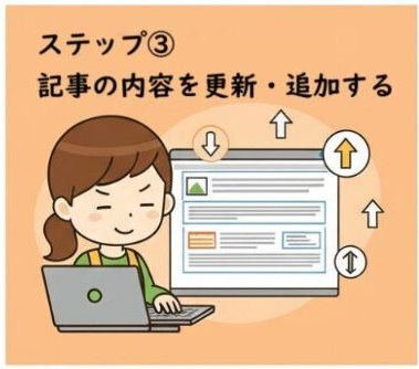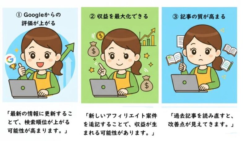 - 最新の情報に更新することで、「読者に有益な情報を提供している」とGoogleに評価され、検索順位が上がる可能性が高まります。