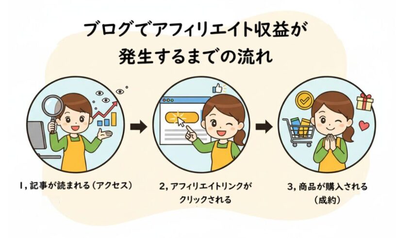 ブログでアフィリエイト収益が発生するまでの流れは、主にこの3つのステップです。