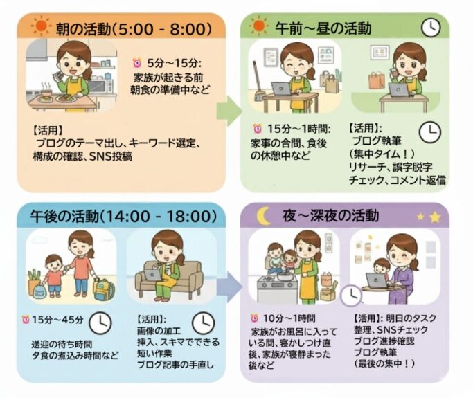 主婦は家事や育児があるので、時間のやりくりが大変ですが、私はちょっとしたスキマ時間を有効活用して、ブログの時間に充てています。