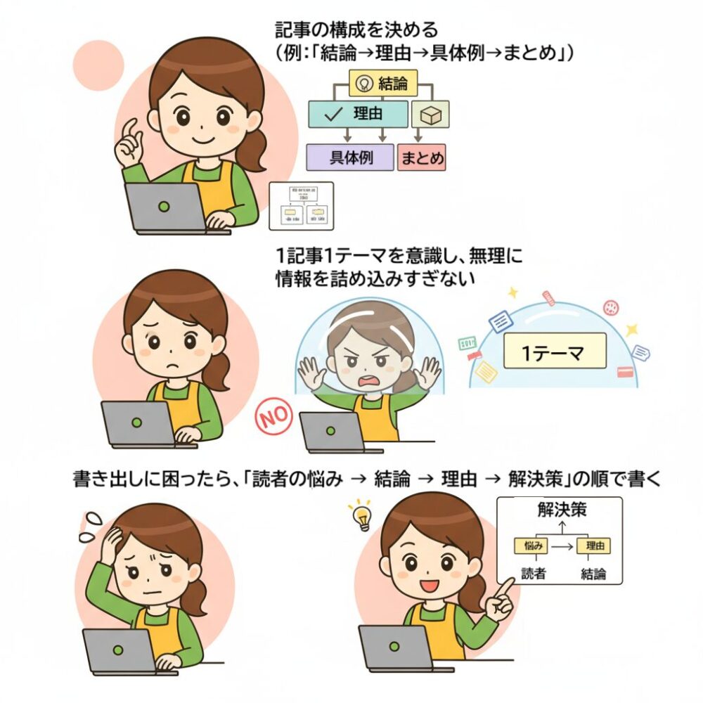 - 1記事1テーマ を意識し、無理に情報を詰め込みすぎない