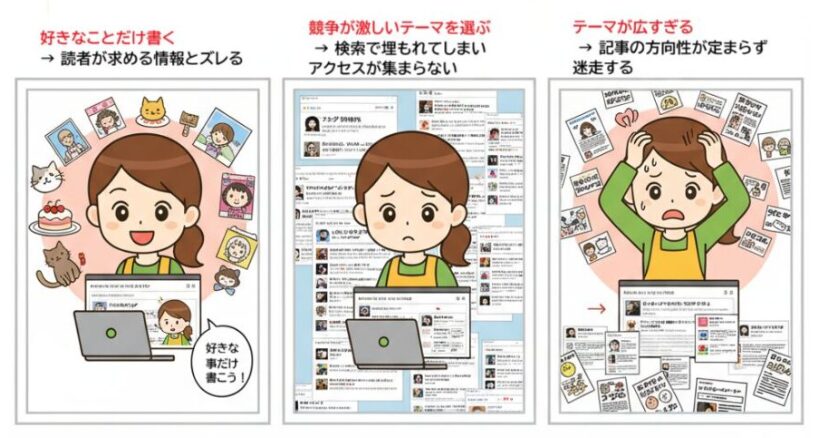 - 競争が激しいテーマを選ぶ → 検索で埋もれてしまいアクセスが集まらない