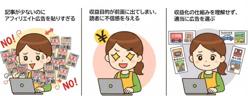 - 収益化の仕組みを理解せず、適当に広告を選ぶ