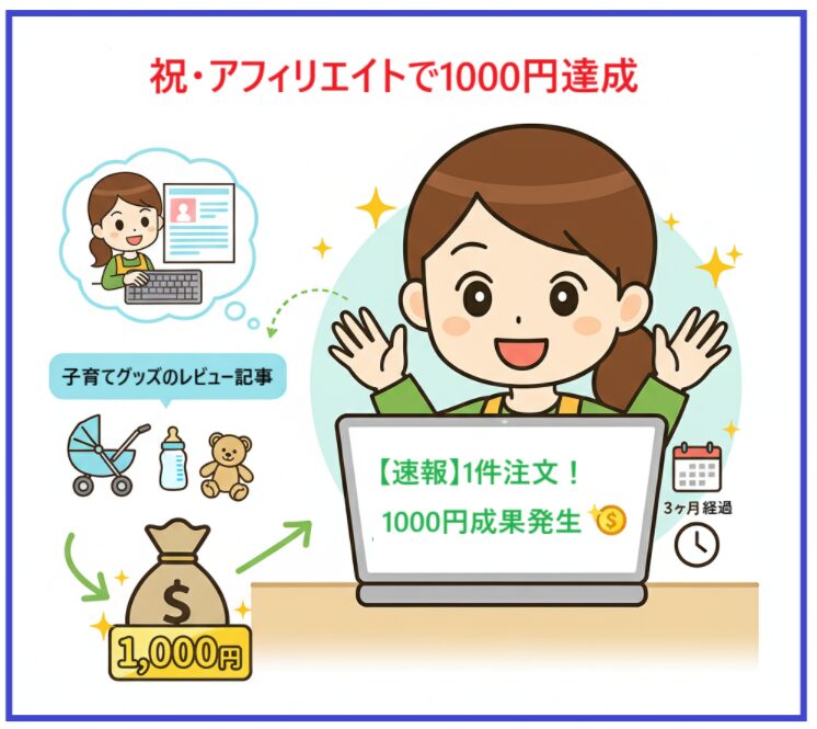 私はブログを開設して3ヶ月後、アフィリエイトで初めて「1,000円」の報酬が発生しました。