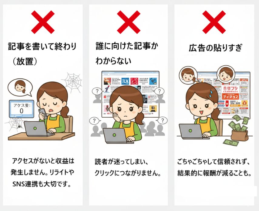 そこで、まずはブログでの収益化に失敗しやすい3つの例をご紹介します。